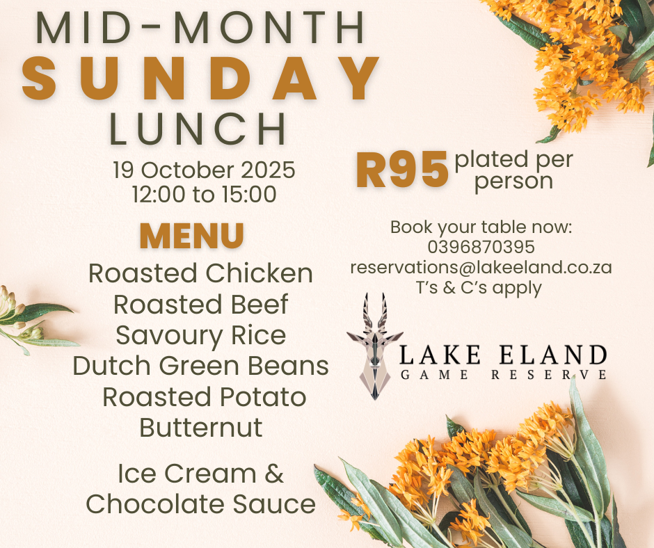 Come and join us for a scrumptious Plate Sunday Lunch. ONLY R95pp